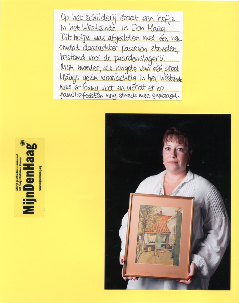 Dit verhaal maakt onderdeel uit van het project MijnDenHaag* Topstukken, waarbij Hagenaars gevraagd wordt naar hun eigen persoonlijke topstuk. 'Céline Kanters Op het schilderij staat een hofje aan het Westeinde in Den Haag. Dit hofje was afgesloten met een hek, omdat daarachter paarden stonden, bestemd voor de paardenslagerij. Mijn moeder, als jongste van een groot ...