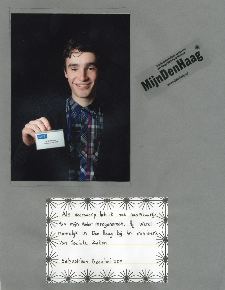 Dit verhaal maakt onderdeel uit van het project MijnDenHaag* Topstukken, waarbij Hagenaars gevraagd wordt naar hun eigen persoonlijke topstuk. 'Als voorwerp heb ik het naamkaartje van mijn vader meegenomen. Hij werkt namelijk in Den Haag bij het Ministerie van Sociale Zaken. Sebastiaan'