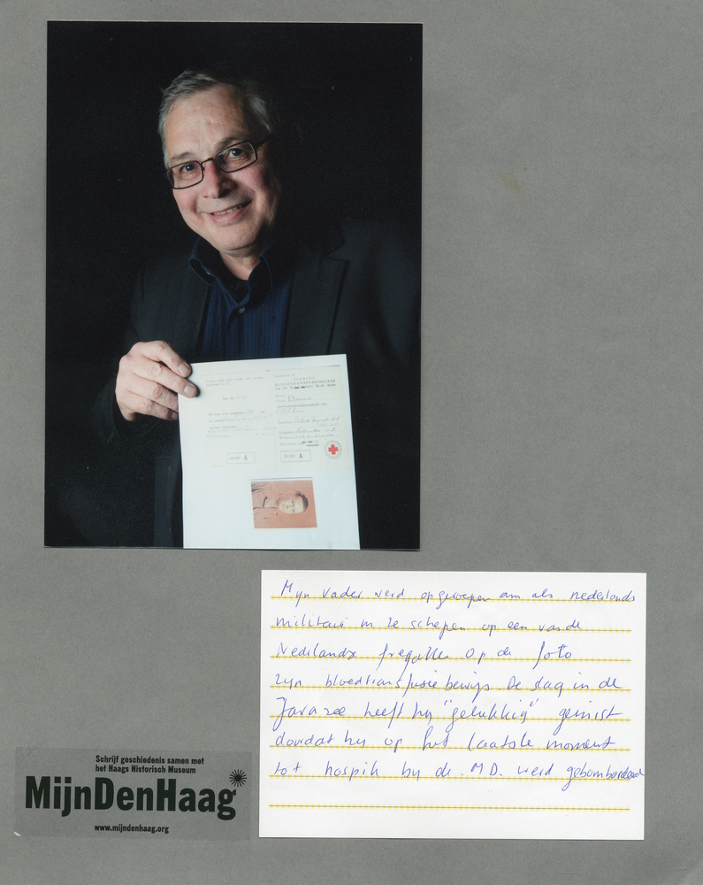 Dit verhaal maakt onderdeel uit van het project MijnDenHaag* Topstukken, waarbij Hagenaars gevraagd wordt naar hun eigen persoonlijke topstuk. 'Mijn vader werd opgeroepen om als Nederlands militair in te schepen op een van de Nederlandse fregatten. Op de foto zijn bloedtransfusiebewijs. De slag in de Javazee heeft hij 'gelukkig' gemist, doordat hij op het laatste ...