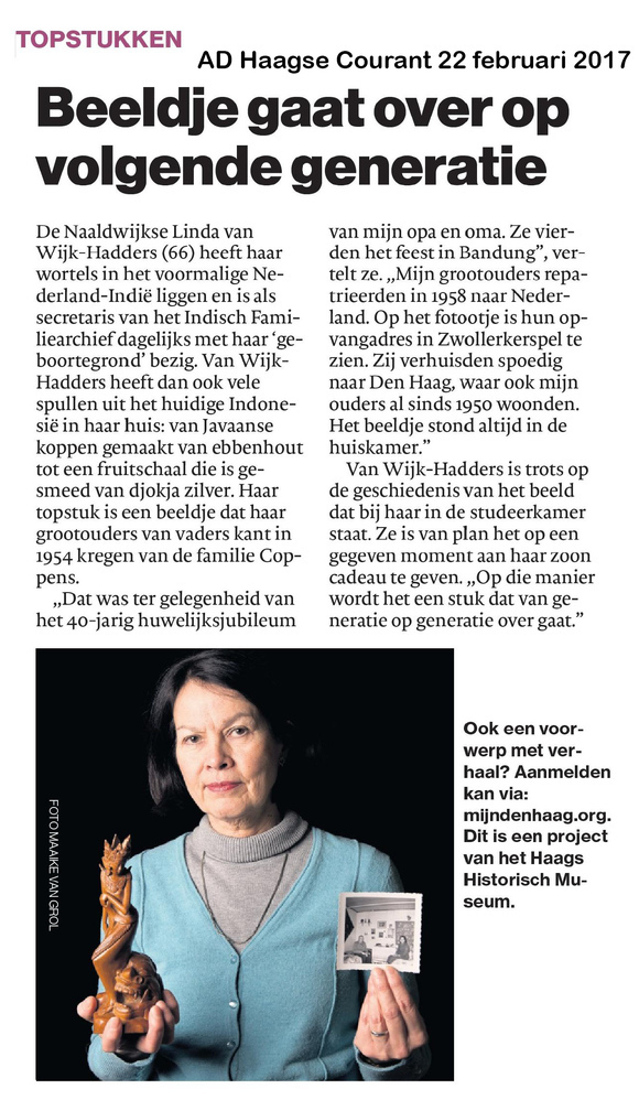 Dit verhaal maakt onderdeel uit van het project MijnDenHaag* Topstukken, waarbij Hagenaars gevraagd wordt naar hun eigen persoonlijke topstuk. 'Het beeldje kregen mijn grootouders Hadders ter gelegenhied van hun 40-jarig huwelijksjubileum van de familie Coppens. Zij vierden het feest in Bandung. Mijn grootouders repatrieerden in 1958 naar Nederland. Het beeldje stond altijd in de huiskamer. ...