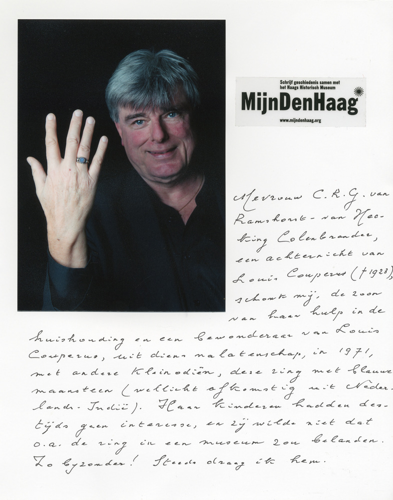 Dit verhaal maakt onderdeel uit van het project MijnDenHaag* Topstukken, waarbij Hagenaars gevraagd wordt naar hun eigen persoonlijke topstuk. 'Mevrouw C.R.G. van Ramshorst-van Hecking Colenbrander, een achternicht van Louis Couperus, schonk mij, de zoon van haar hulp in de huishouding en een bewonderaar van Louis Couperus, uit diens nalatenschap in 1971, met andere kleinoden, deze ...