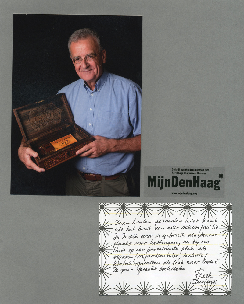 Dit verhaal maakt onderdeel uit van het project MijnDenHaag* Topstukken, waarbij Hagenaars gevraagd wordt naar hun eigen persoonlijke topstuk. 'Deze houten gesneden kist komt uit het bezit van mijn schoonfamilie. In Indië eerst in gebruik als bewaarplaats voor kettingen, nu bij ons thuis op een pominente plek als sigaren/sigarettenkist, inclusief kreteksigaretten als link naar Indië. ...