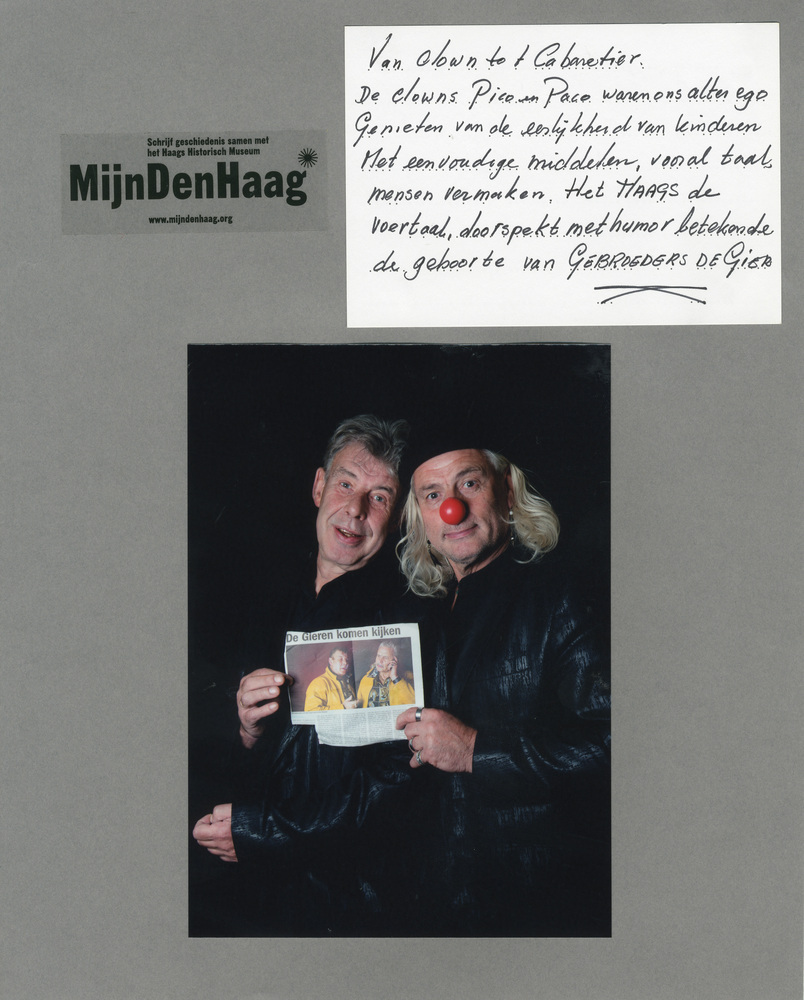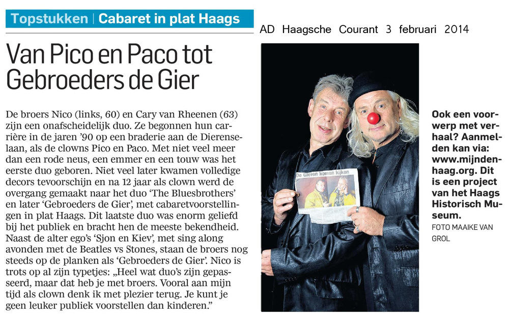 Dit verhaal maakt onderdeel uit van het project MijnDenHaag* Topstukken, waarbij Hagenaars gevraagd wordt naar hun eigen persoonlijke topstuk. 'Van clown tot cabaretier. De clowns Pico en Paco waren ons alter ego. Genieten van de eerlijkheid van kinderen. Met eenvoudige middelen, vooral taal, mensen vermaken. Het HAAGS, de voertaal, doorspekt met humor betekende de geboorte ...