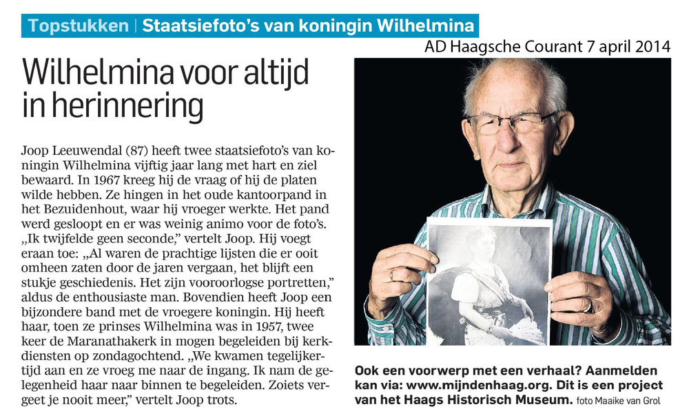 Dit verhaal maakt onderdeel uit van het project MijnDenHaag* Topstukken, waarbij Hagenaars gevraagd wordt naar hun eigen persoonlijke topstuk. 'Een statiefoto van Koningin Wilhelmina. Haar regeerperiode 1898-1948. In de Maranathakerk in Den Haag heb ik haar twee maal mogen begeleiden. De heer J.D. Leeuwendal'