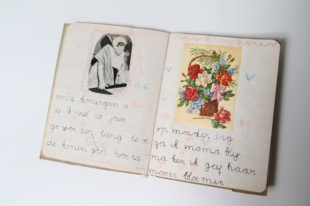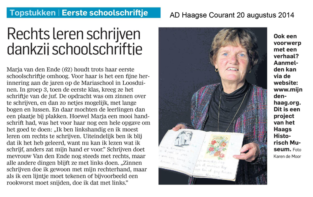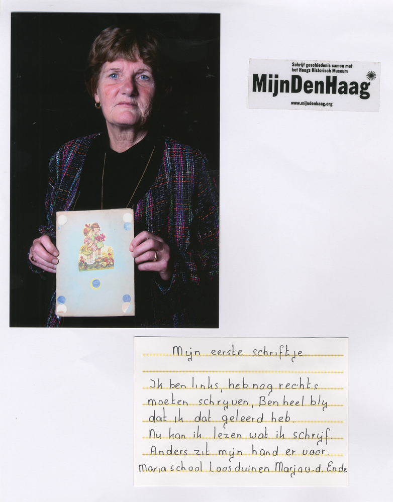 Dit verhaal maakt onderdeel uit van het project MijnDenHaag* Topstukken, waarbij Hagenaars gevraagd wordt naar hun eigen persoonlijke topstuk. 'Mijn eerste schriftje Ik ben links, heb nog rechts moeten schrijven. Ben heel blij dat ik dat geleerd heb. Nu kan ik lezen wat ik schrijf, anders zit mijn hand er voor. Mariaschool Loosduinen. Marja van ...