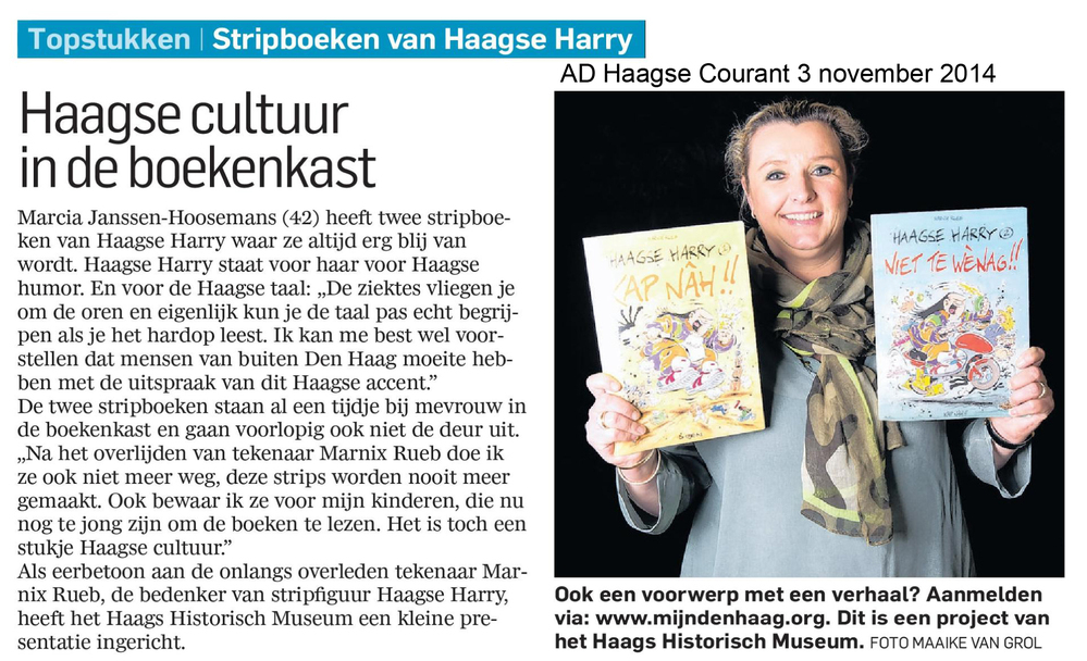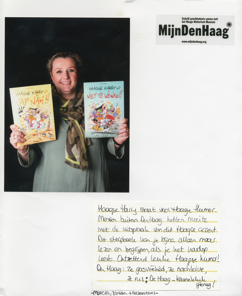 Dit verhaal maakt onderdeel uit van het project MijnDenHaag* Topstukken, waarbij Hagenaars gevraagd wordt naar hun eigen persoonlijke topstuk. 'Marcia Janssen-Hoosemans Haagse Harry staat voor Haagse humor. Mensen buiten Den haag hebben moeite met de uitspraak van dit Haagse accent. Dit stripboek kan je bijna alleen maar lezen en begrijpen als het hardop leest. Ontzettend ...