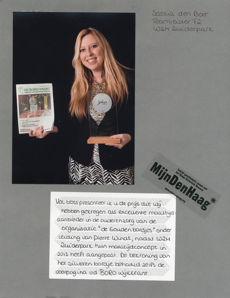 Dit verhaal maakt onderdeel uit van het project MijnDenHaag* Topstukken, waarbij Hagenaars gevraagd wordt naar hun eigen persoonlijke topstuk. 'Vol trots presenteer ik u de prijs die wij hebben gekregen als excellente maaltijdaanbieder in de ouderenzorg van de organisatie 'de Gouden bordjes' onder leiding van Pierre Windt, nadat WZH Zuiderpark hun maaltijdconcept in 2013 heeft ...