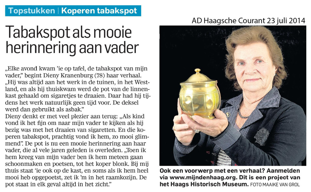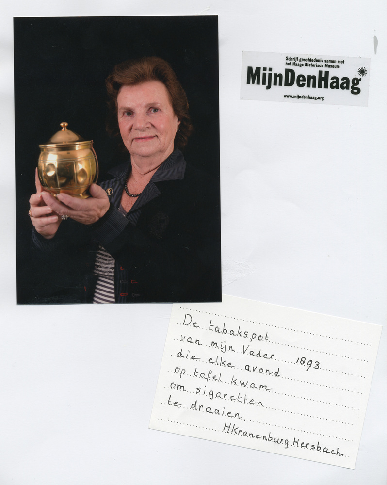 Dit verhaal maakt onderdeel uit van het project MijnDenHaag* Topstukken, waarbij Hagenaars gevraagd wordt naar hun eigen persoonlijke topstuk. 'De tabakspot (1893) van mijn vader die elke avond op tafel kwam om sigaretten te draaien. H. Kranenburg Hersbach Deze MijnDenHaag* deelnemer is verbonden aan Zorgcentrum WZH Zuiderpark.'