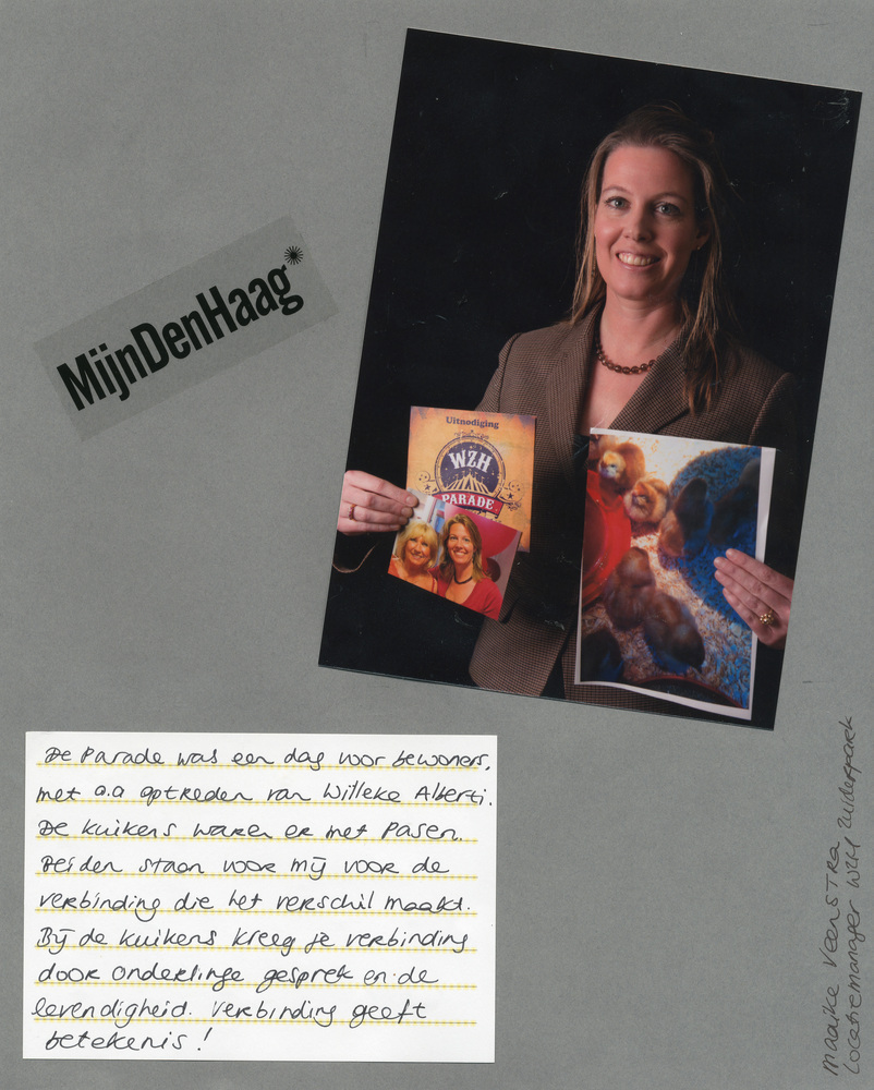 Dit verhaal maakt onderdeel uit van het project MijnDenHaag* Topstukken, waarbij Hagenaars gevraagd wordt naar hun eigen persoonlijke topstuk. 'De Parade was een dag voor bewoners, met o.a. optreden van Willeke Alberti. De kuikens waren er met Pasen. Beiden staan voor mij voor de verbinding die het verschil maakt. Bij de kuikens kreeg je verbinding ...