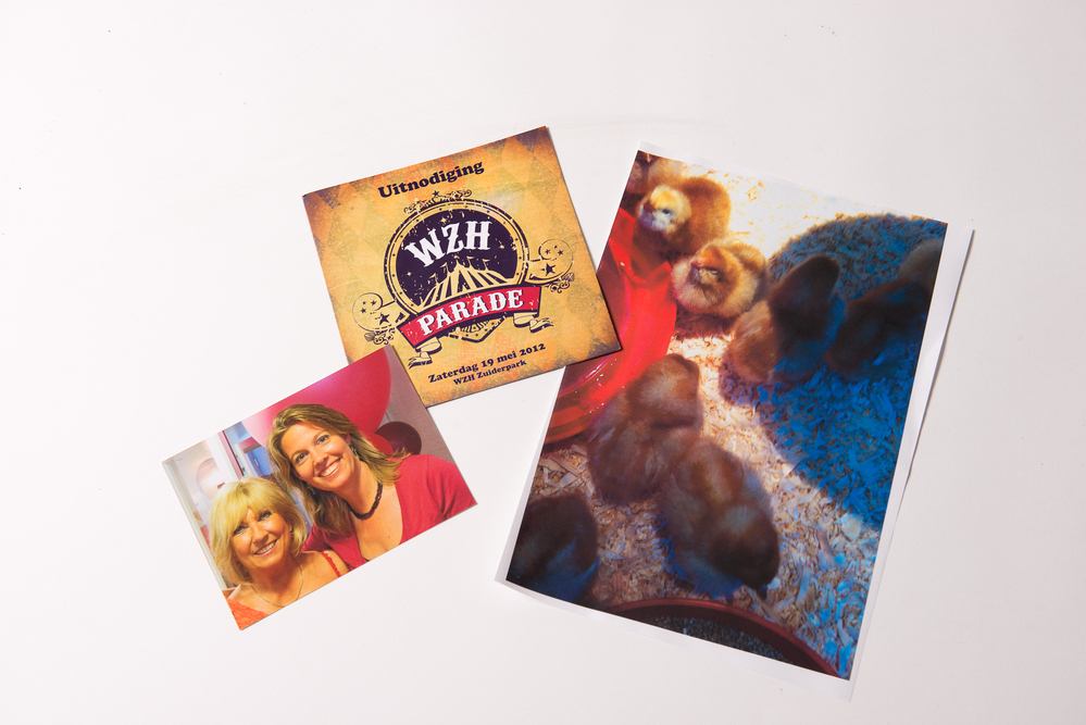 Het topstuk (uitnodiging van WZH Parade (evenement) en foto van kuikens tijdens het Paasfeest) van Maaike Veenstra