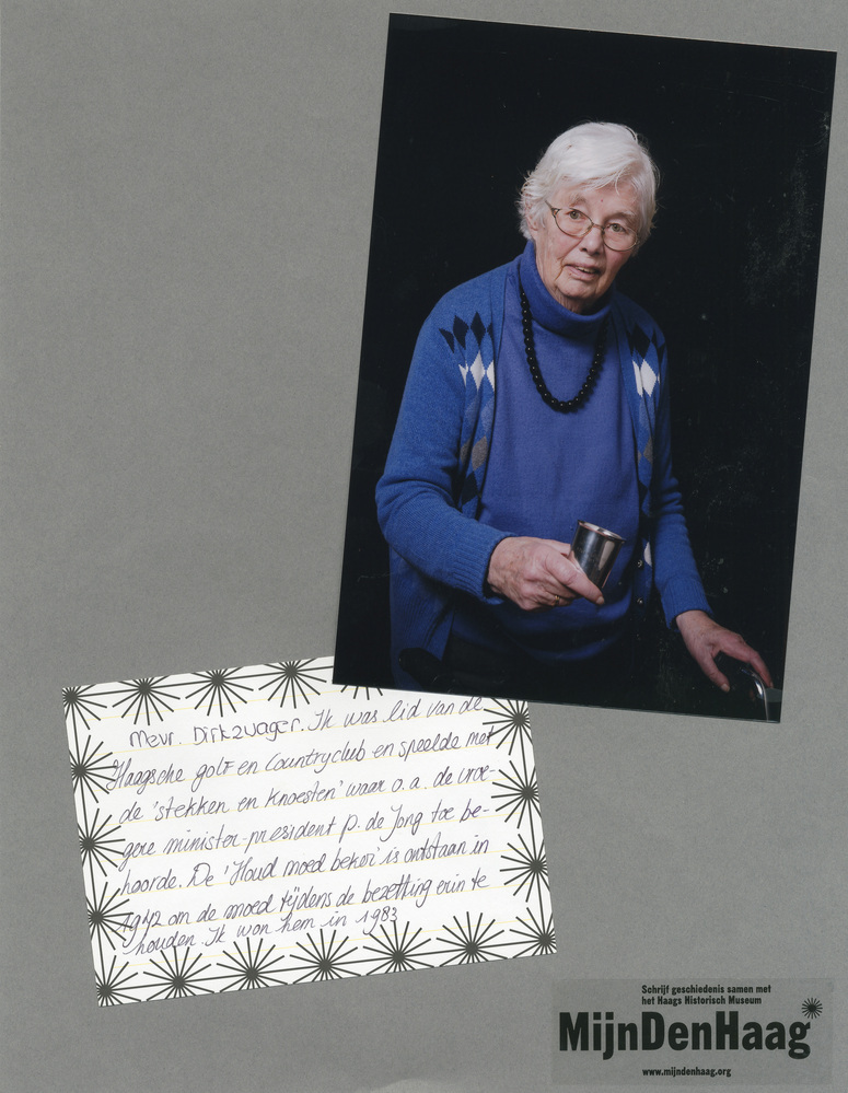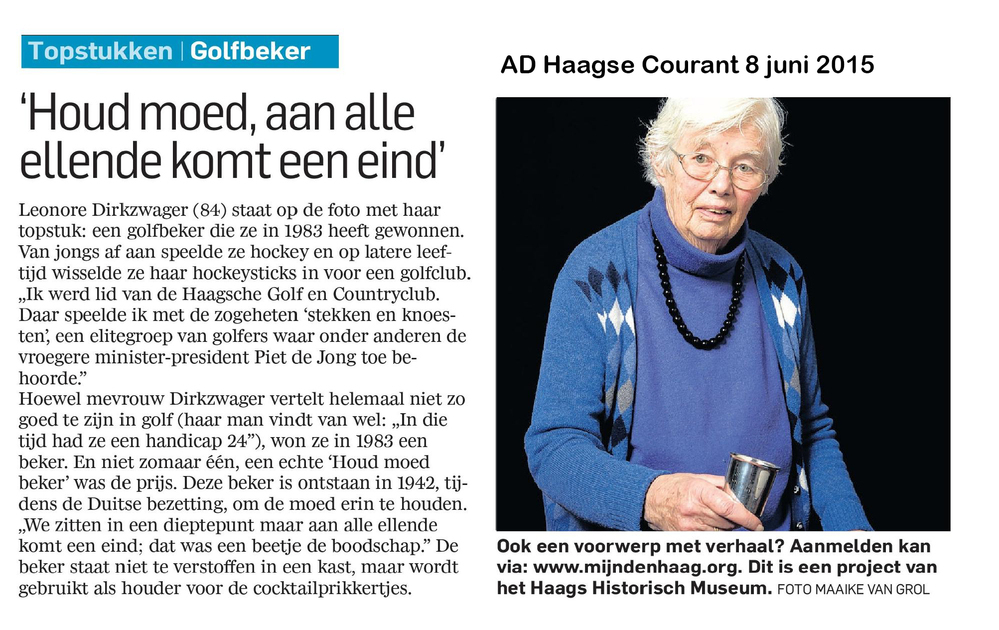 Dit verhaal maakt onderdeel uit van het project MijnDenHaag* Topstukken, waarbij Hagenaars gevraagd wordt naar hun eigen persoonlijke topstuk. 'Mevr. Dirkzwager Ik was lid van de Haagsche Golf en Coutryclub en speelde met de “stekken en knoesten” waar o.a. de vroegere minister-president P. de Jong toe behoorde. De “Houd moed beker” is ontstaan in 1942 ...