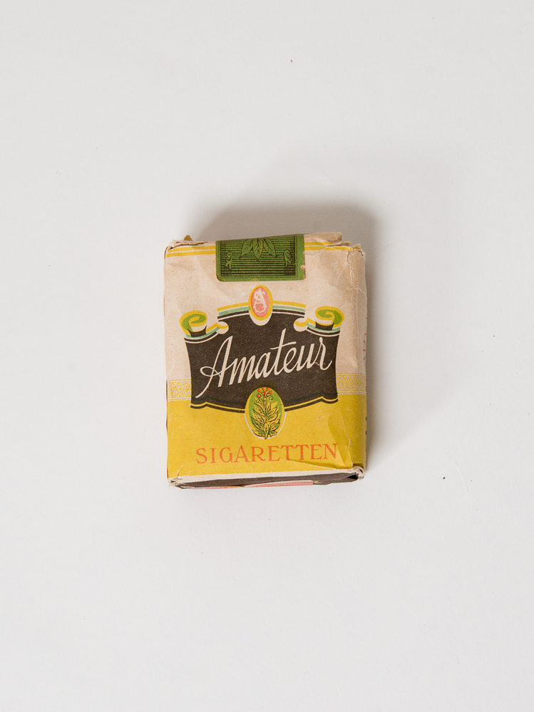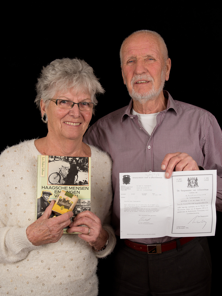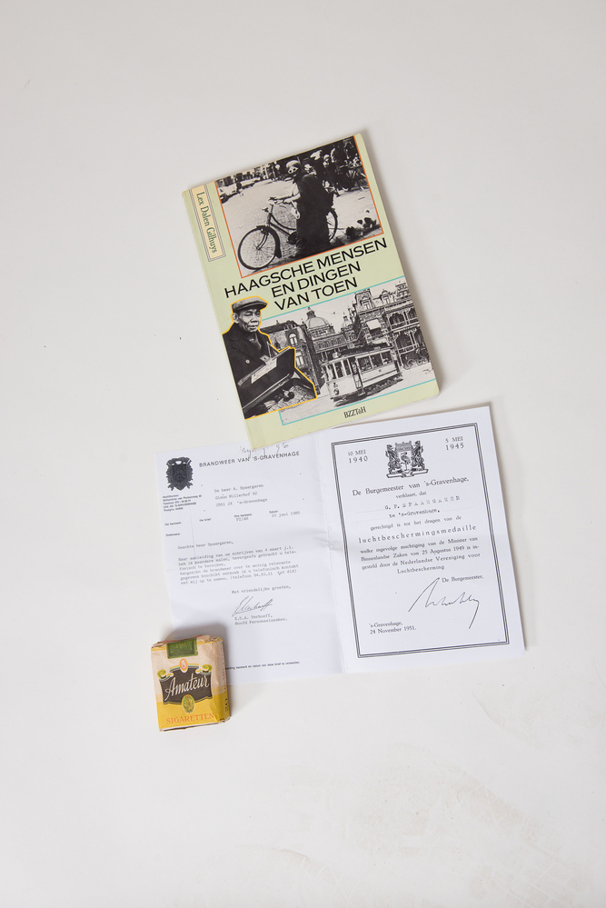 Het topstuk (boek 'Haagsche mensen en dingen van toen', document toekenning luchtbeschermingsmedaille en pakje sigaretten) van de heer en mevrouw Spaargaren