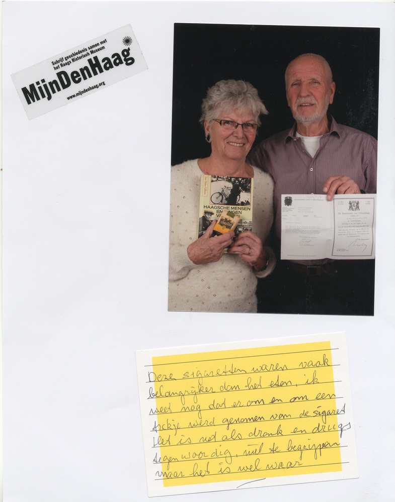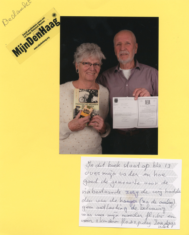 Dit verhaal maakt onderdeel uit van het project MijnDenHaag* Topstukken, waarbij Hagenaars gevraagd wordt naar hun eigen persoonlijke topstuk. 'In dit boek staat op blz. 13 over mijn vader en hoe goed de gemeente voor de nabestaanden zorgde. Wij hadden van de honger (na de oorlog) geen ontlasting. De beloning was voor mijn moeder fl.1.65 ...