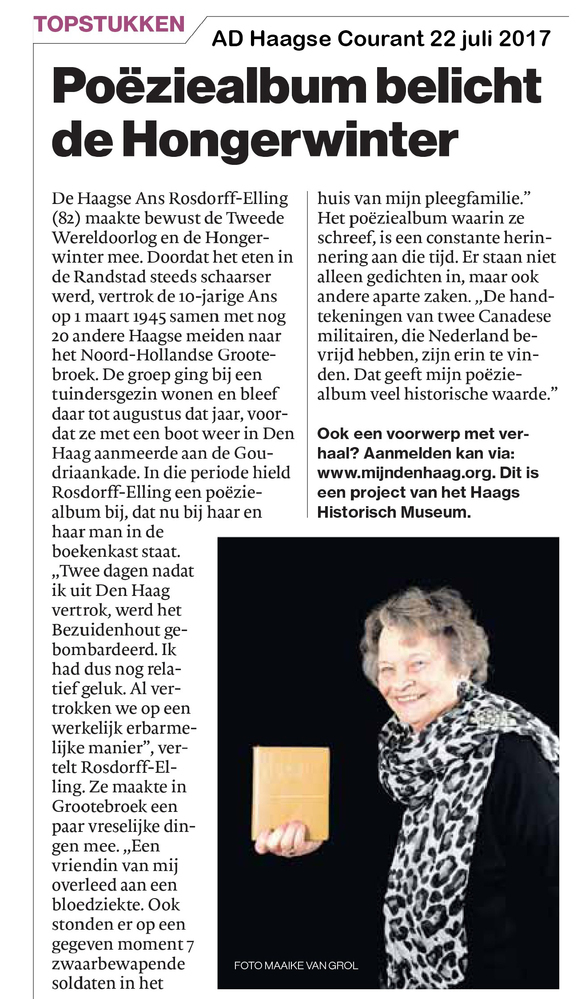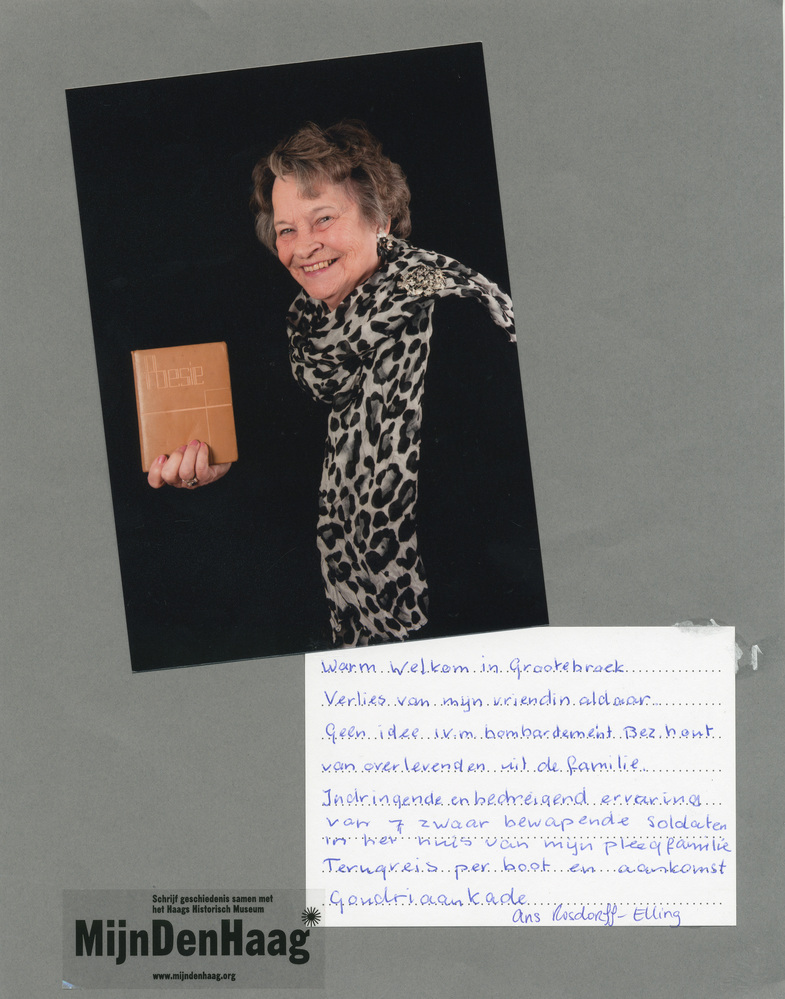Dit verhaal maakt onderdeel uit van het project MijnDenHaag* Topstukken, waarbij Hagenaars gevraagd wordt naar hun eigen persoonlijke topstuk. 'Warm welkom in Grootebroek. Verlies van mijn vriendin aldaar. Geen idee in verband met bombardement Bezuidenhout van overlevenden uit de familie. Indringende en bedreigende ervaring van 7 zwaar bewapende soldaten in het huis van mijn pleegfamilie. ...