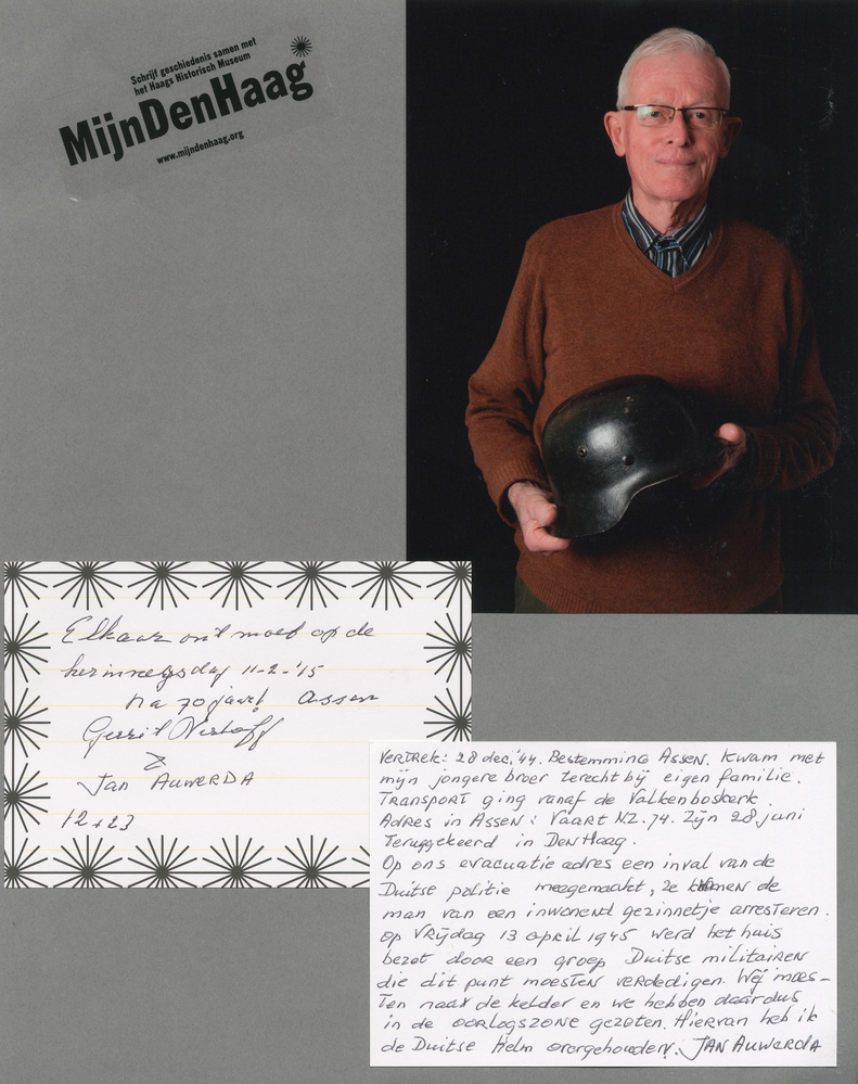Dit verhaal maakt onderdeel uit van het project MijnDenHaag* Topstukken, waarbij Hagenaars gevraagd wordt naar hun eigen persoonlijke topstuk. 'Dhr. Auwerda Vertrek 28 dec. ’44 bestemming Assen. Kwam met mijn jongere broer terecht bij eigen familie. Transport ging vanaf de Valkenboskerk. Adres in Assen: Vaart N.Z. 74. Zijn 28 juni teruggekeerd in Den Haag. Op ...