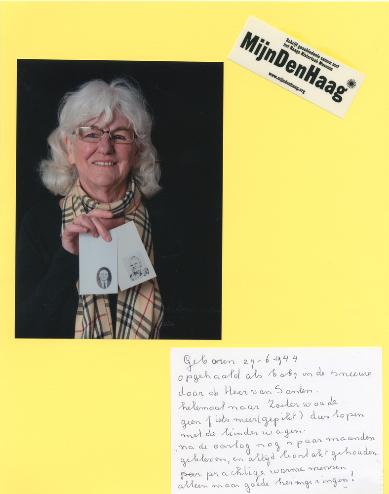 Dit verhaal maakt onderdeel uit van het project MijnDenHaag* Topstukken, waarbij Hagenaars gevraagd wordt naar hun eigen persoonlijke topstuk. 'Mevr. Breugel-Knijnenburg Geboren 27-6-1944. Opgehaald als baby in de sneeuw door de heer van Santen. Helemaal naar Zoeterwoude, geen fiets meer (gepikt) dus lopen met de kinderwagen. Na de oorlog nog een paar maanden gebleven en ...