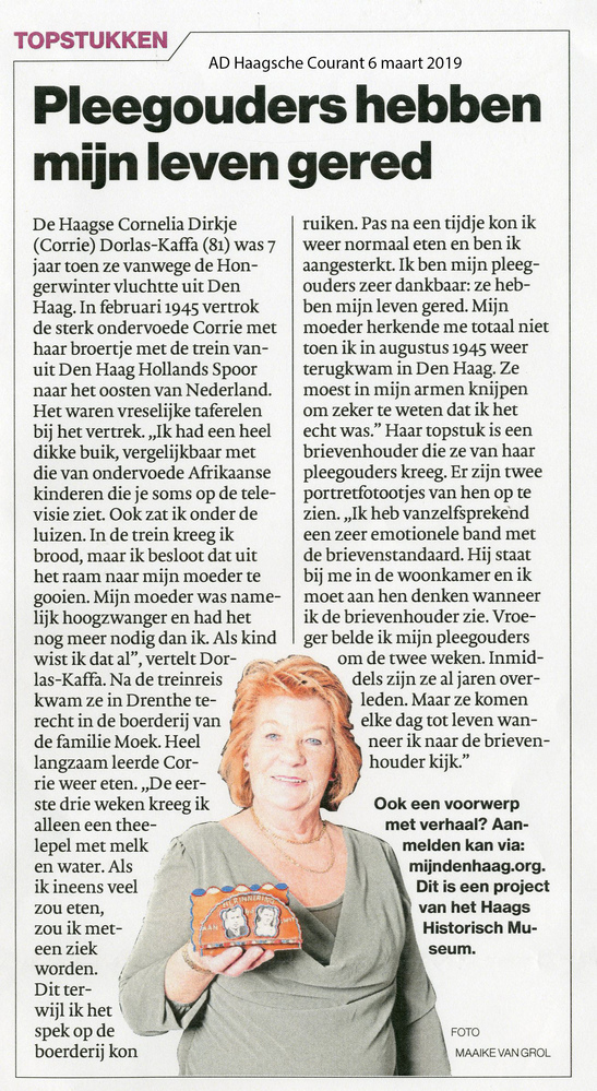 Dit verhaal maakt onderdeel uit van het project MijnDenHaag* Topstukken, waarbij Hagenaars gevraagd wordt naar hun eigen persoonlijke topstuk. 'mevr. Dorlas-Kaffa Deze brievenhouder heb ik als aandenken gekregen van mijn pleegouders. Moek in de hongerwinter.'