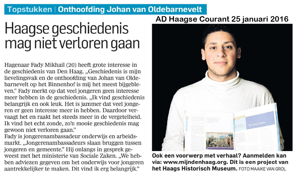Dit verhaal maakt onderdeel uit van het project MijnDenHaag* Topstukken, waarbij Hagenaars gevraagd wordt naar hun eigen persoonlijke topstuk. 'De meest bijgebleven gebeurtenis in de geschiedenis is de onthoofding van Johan van Oldebarnevelt op het Binnenhof. De geschiedenis van Den Haag is heel rijk en mag niet verloren gaan. Ook voor mij als Haagse jongerenambassadeur ...