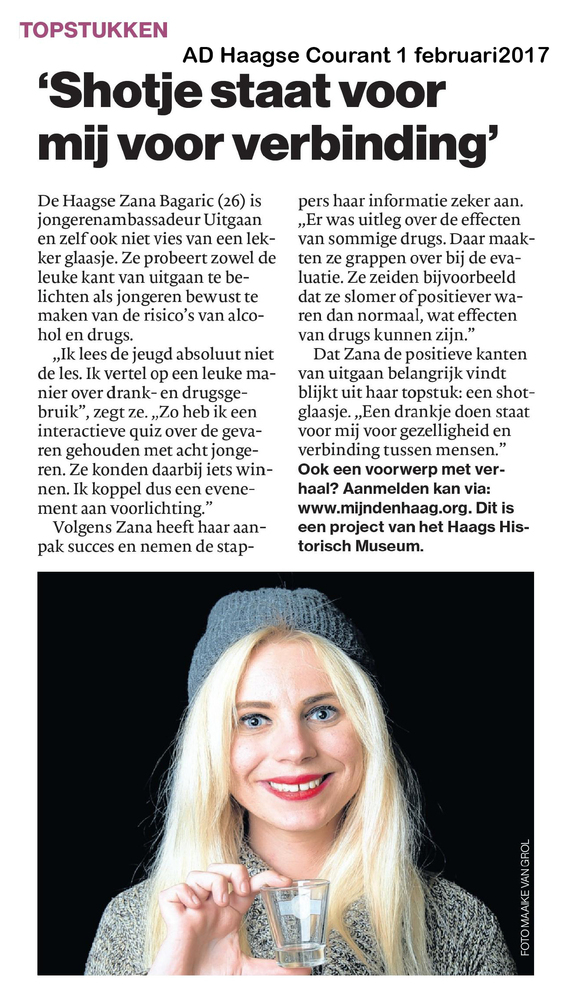 Dit verhaal maakt onderdeel uit van het project MijnDenHaag* Topstukken, waarbij Hagenaars gevraagd wordt naar hun eigen persoonlijke topstuk. 'Als jongerenambassadeur Uitgaan, ben ik voornamelijk bezig om beide kanten van uitgaan naar voren te laten komen. Zowel de leuke kant als de bewustwording van gebruik van alcohol en drugs. Mijn voorwerp - ik houd ook ...