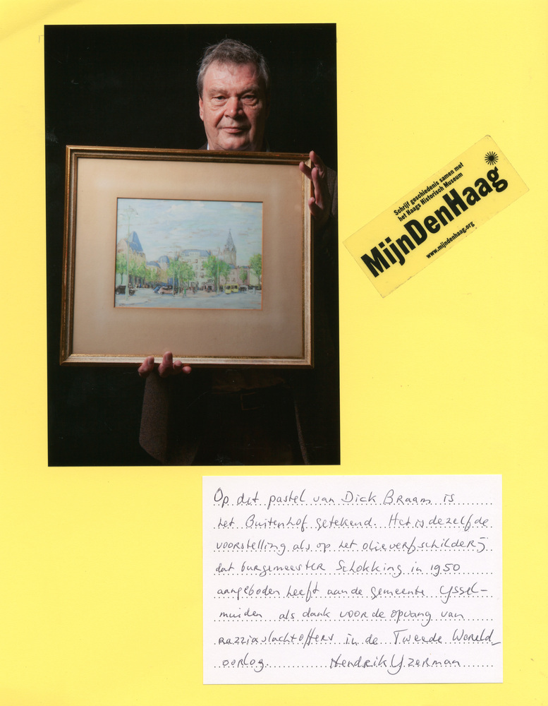 Dit verhaal maakt onderdeel uit van het project MijnDenHaag* Topstukken, waarbij Hagenaars gevraagd wordt naar hun eigen persoonlijke topstuk. 'Op dit pastel van Dick Braam is het Buitenhof getekend. Het is dezelfde voorstelling als op het olieverfschilderij dat burgemeester Schokking in 1950 aangeboden heeft aan de gemeente IJsselmuiden als dank voor de opvang van razziaslachtoffers ...