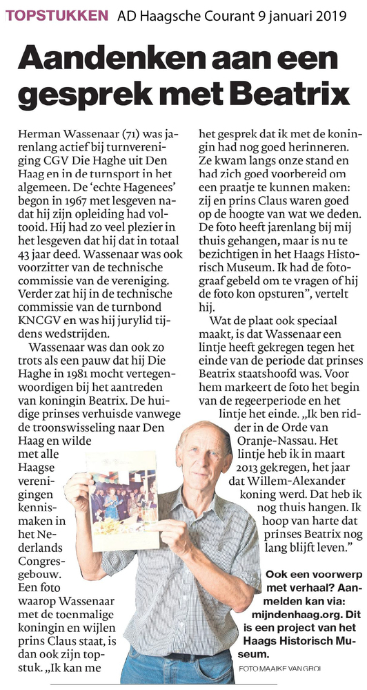 Dit verhaal maakt onderdeel uit van het project MijnDenHaag* Topstukken, waarbij Hagenaars gevraagd wordt naar hun eigen persoonlijke topstuk. 'De statuten zijn door koningin Wilhelmina goedgekeurd en haar kleindochter Beatrix verwelkomde bij haar aantreden als koningin alle Haagse verenigingen in het Nederlands Congresgebouw in 1981. Die Haghe Den Haag Herman Wassenaar'