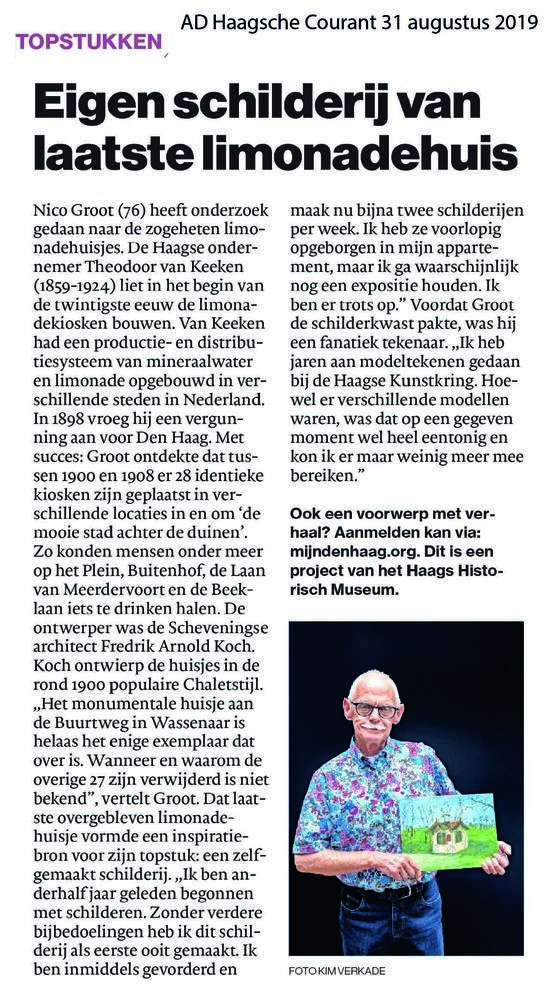 Dit verhaal maakt onderdeel uit van het project MijnDenHaag* Topstukken, waarbij Hagenaars gevraagd wordt naar hun eigen persoonlijke topstuk. 'Nico Groot Dit limonadehuisje diende als model voor mijn onderzoek naar de 28 locaties waar dit type huisje in en om Den Haag tussen 1900 en 1908 zijn geplaatst. De Haagse ondernemer Theodoor van Keeken was ...