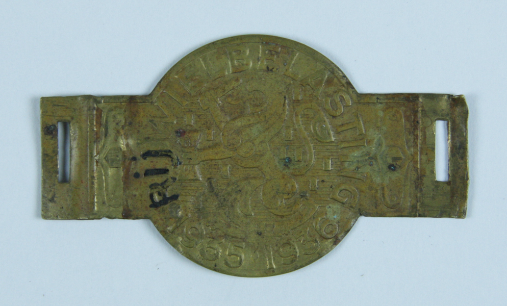 Metalen fietsplaatje met rondschrift in reliëf: 'RIJWIELBELASTING 1935 1936'. In het midden afbeelding van het rijkswapen.