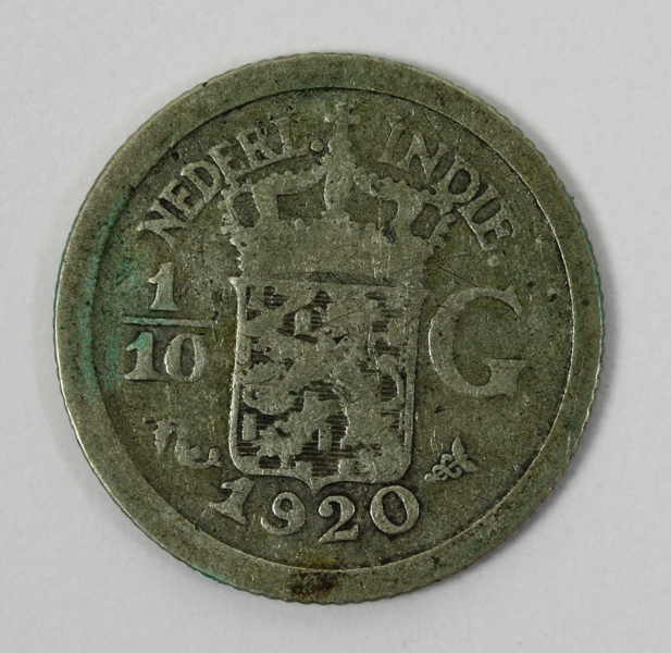 Dubbeltje uit Nederlands Indië uit de regeringsperiode van koningin Wilhelmina. Op de voorzijde een afbeelding van het rijkswapen en de waarde. Op de keerzijde een Javaanse tekst.
