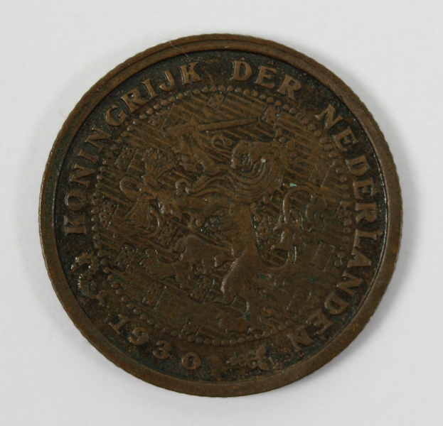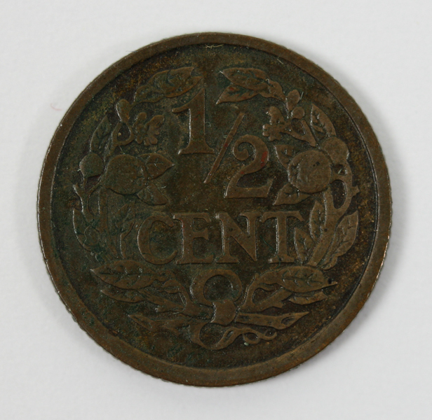 Halve cent uit de regeringsperiode van koningin Wilhelmina. Op de voorzijde een gekroonde leeuw met zwaard en pijlenbundel in een veld met blokken. Op de keerzijde de waarde tussen twee samengebonden oranjetakken.