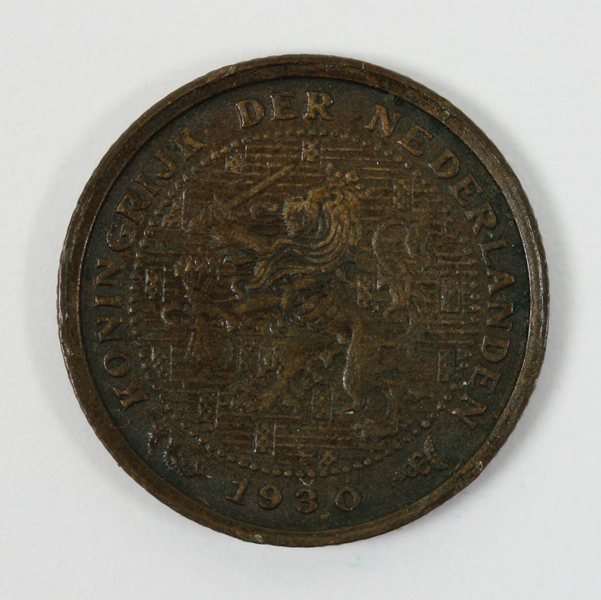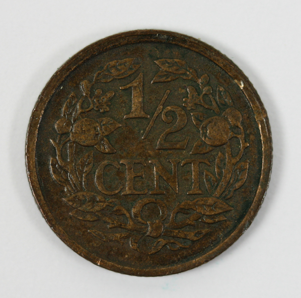 Halve cent uit de regeringsperiode van koningin Wilhelmina. Op de voorzijde een gekroonde leeuw met zwaard en pijlenbundel in een veld met blokken. Op de keerzijde de waarde tussen twee samengebonden oranjetakken.