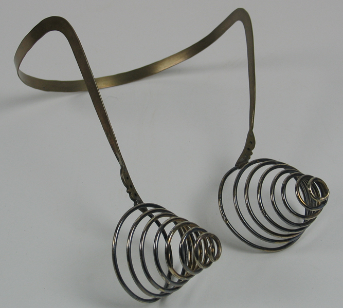 Oorijzer met twee krullen. Met koperen hoofdband en vergulde krullen. De krullen hebben acht windingen.