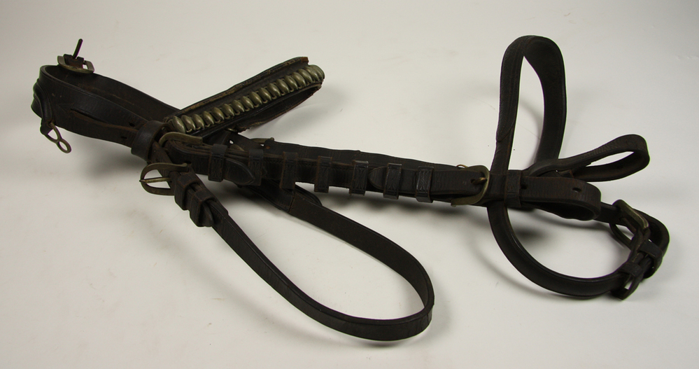 Hoofdstel, zwart bewerkt, zonder bit, met extra lussen ter decoratie aan de bakstukken en een bewerkte frontriem met geschakelde ovalen erop bevestigd.