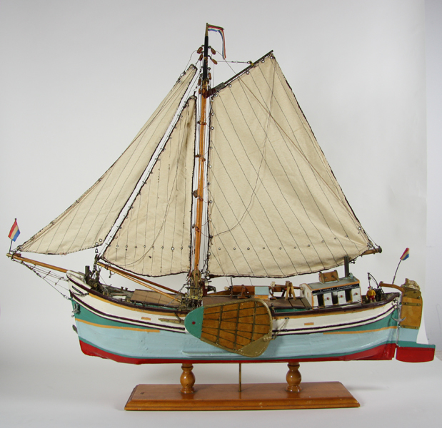 Scheepsmodel van zeilklipperaak 'VOOR DEN TIJD'. Getuigd. Met rood, blauw, groen en bruin beschilderd.