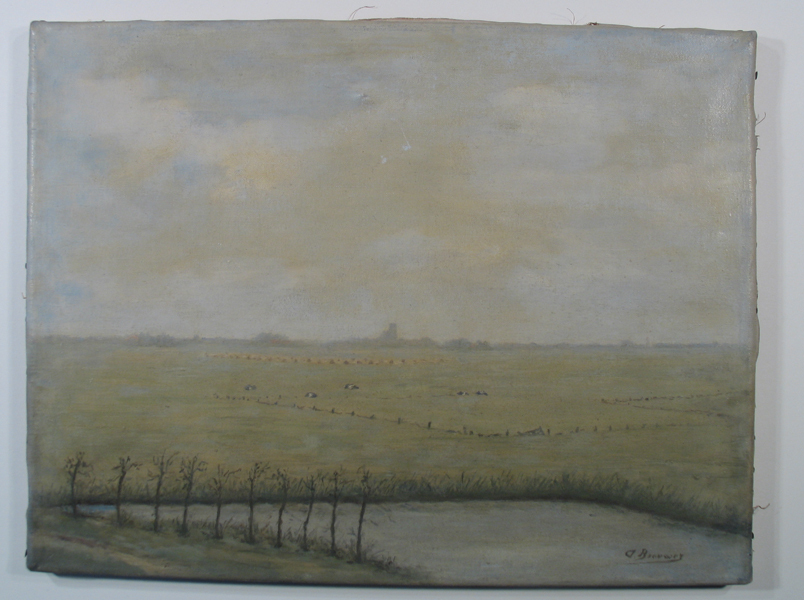 Olieverf schilderij, polychroom beschilderd, met gezicht op Brielle vanaf de Heindijk bij het Stenen Baken. In de verte wordt Brielle afgebeeld met daarvoor weiland, enkeke koeien en een sloot.