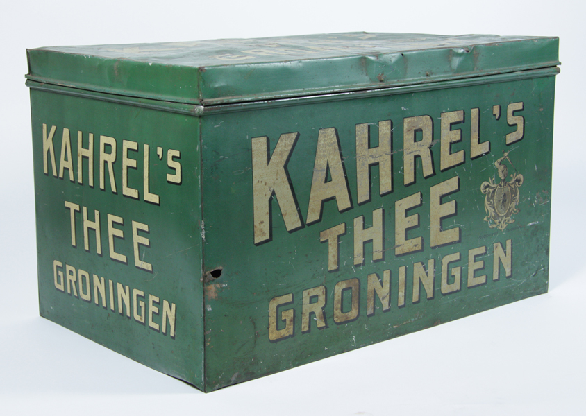 Theeblik, rechthoekig met scharnierend groen met zwarte deksel, witte en gele bedrukking, en opschrift 'KAHREL'S THEE GRONINGEN' en met voorstelling van het persoonswapen van Kahrel(?).