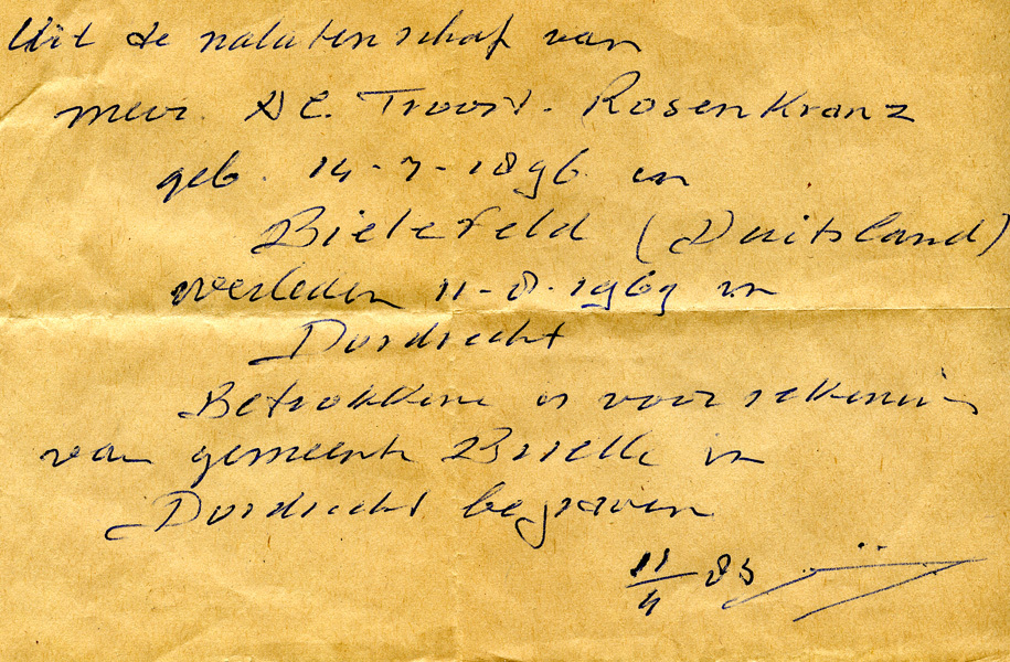 Geschreven brief i.v.m. afhandeling van de nalatenschap van mevr. A.C. Troost-Rosenkranz.