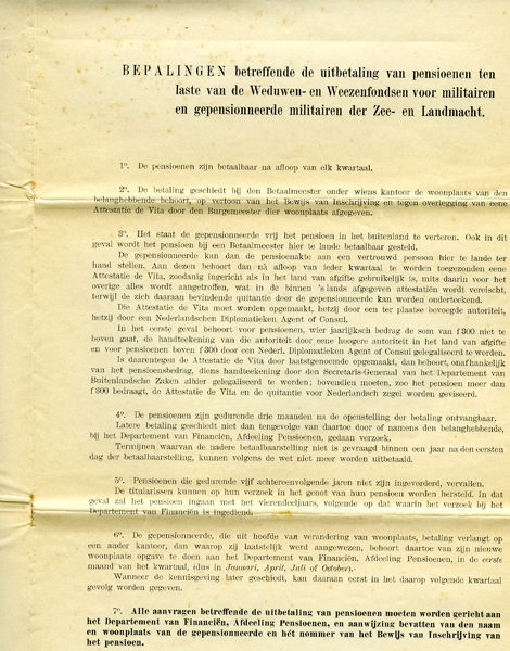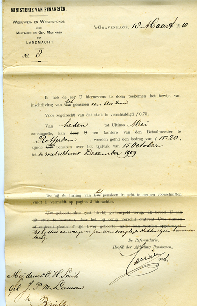 Brief, deels gedrukt en deels beschreven met inkt, van Ministerie van Financiën, Weduwe- en Wezenfonds voor Militairen en Gep. Militairen der Landmacht aan Jacoba Pieternella van Leeuwen, weduwe van Cornelis Hendrik Smits. Inhoud brief o.a. bewijs van inschrijving van het pensioen voor haar zoon Adrianus Arie Smits. Brief bestaat uit twee dubbelgevouwen pagina's.