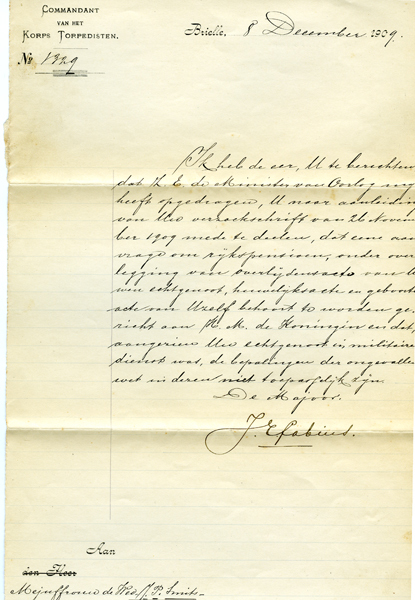 Brief van Commandant van het Korps Torpedisten aan Jacoba Pieternella van Leeuwen, weduwe van Cornelis Hendriks Smits. Brief ondertekend door majoor. Inhoud brief o.a. over rijkspensioen in verband met overleden echtgenoot.