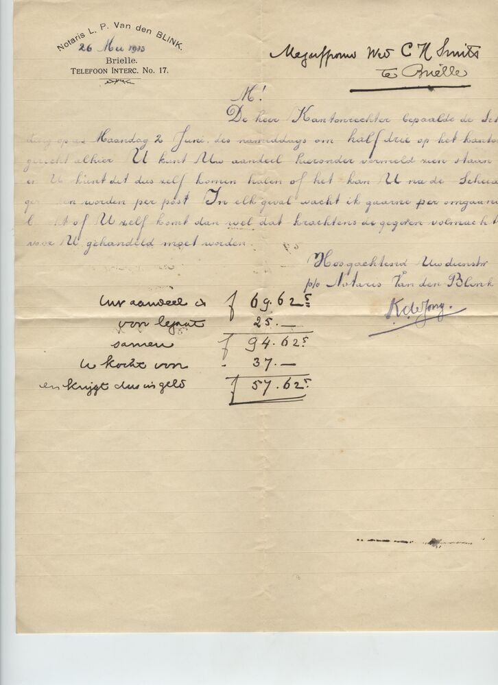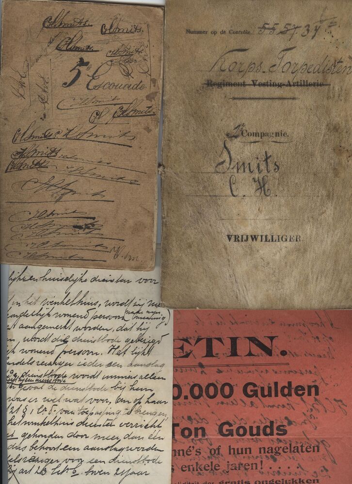 Envelop met daarin diverse documentatie uit nalatenschap van Cornelis Hendrik Smits te Brielle. Documentatie bestaat uit o.a. zakboekje Korps Torpedisten en brieven van o.a. notaris L.P. v.d. Blink.