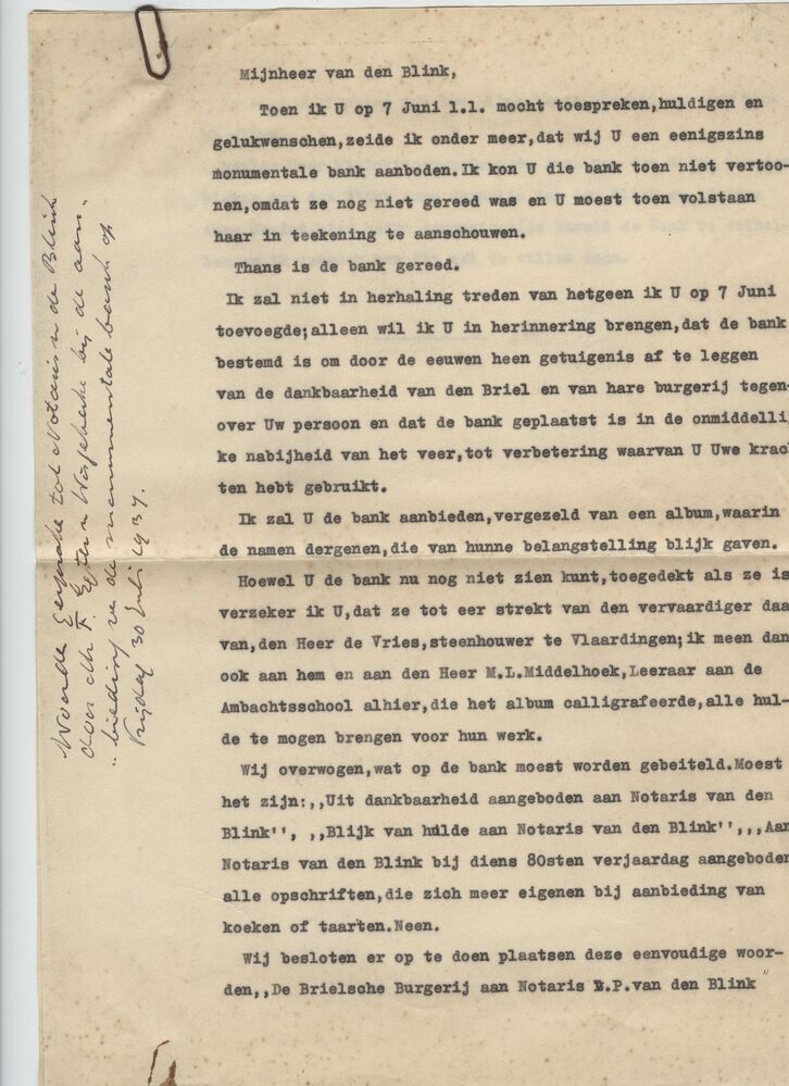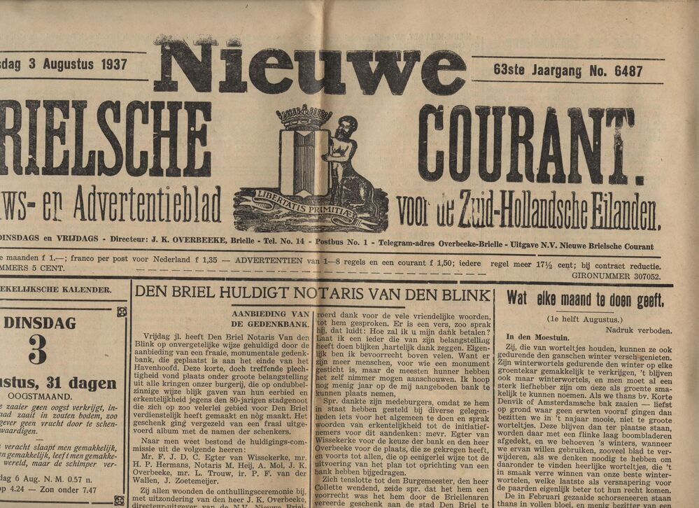 Bruine map getiteld: 'Herbarium' met daarin diverse documentatie over notaris L.P. van den Blink te Brielle. Meeste documenten gaan over de huldiging van 80-jarige notaris L.P. van den Blink uit Brielle. Documentatie bestaat uit een toespraak van oud burgemeester Egter van Wissekerke, 4 x Brielse Courant van 3 augstus 1937 met op voorpagina artikel: 'Den ...
