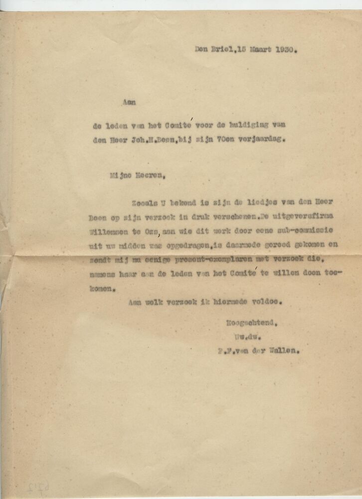 Brief van P.F. van der Wallen over huldiging Joh. H. Been voor 70e verjaardag.