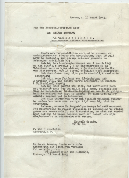 Brief van burgemeester Rockanje namens P. van Rietschoten aan Rijkscommissaris Syss-Inquart waarin toestemming wordt gevraagd voor verlof van Jurphaas van Rietschoten (zoon van P. van Rietschoten) die in Duitsland te werk wordt gesteld. Aanvraag verlof is n.a.v. het overlijden van Maaike van Rietschoten (1929-1943) die tijdens het bombaredement op de meisjesvakschool op 4 maarkt 1943 ...