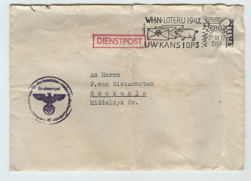 Brief van Rijkscommissaris aan dhr. P. van Rietschoten met antwoord op diens brief van 10 maart 1943. Op de brief linksboven het embleem van Nazi-Duitsland met de adelaar. Met bijhorende envelop waarop eveneens embleem Nazi-Duitsland.
