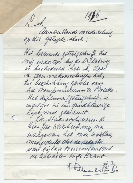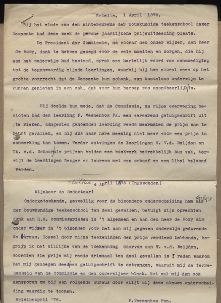 Brief geschreven door P. Veenenbos over het toekennen van prijzen en getuigschriften aan leerlingen van de bouwkundige tekenschool.