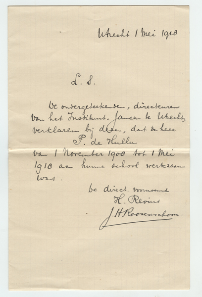 Brief met een referentie van Instistuut Jansen te Utrecht aan Pieter de Hullu (1888-1975) geschreven op 1 mei 1928.