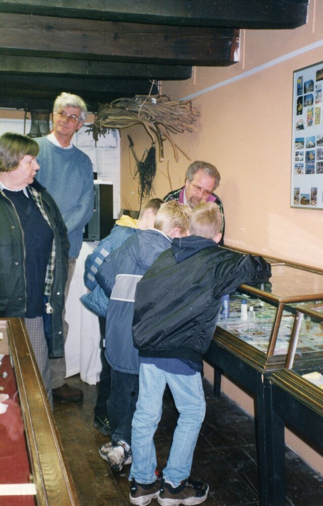 Foto, kleur, "Kijk dat verzamel ik": Schoolkinderen die uitleg geven aan Jan Baljon.De heer en mevrouw Moret kijken mee.