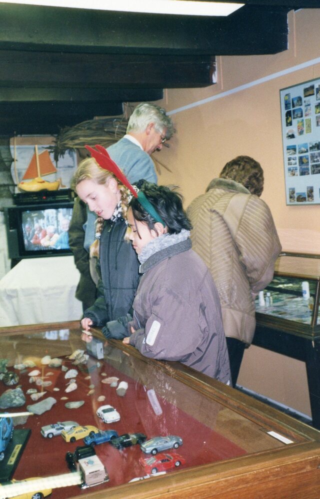 Foto, kleur, "Kijk dat verzamel ik". Kinderen bekijken vitrine met automodellen en schelpen.
