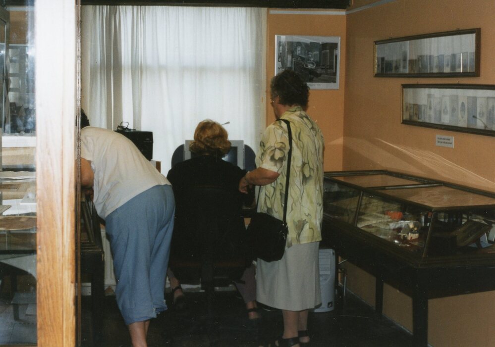 Foto, kleur, "Kijk dat verzamel ik". Els Schouwenburg op de computer, mevrouw Boezaard kijkt toe.