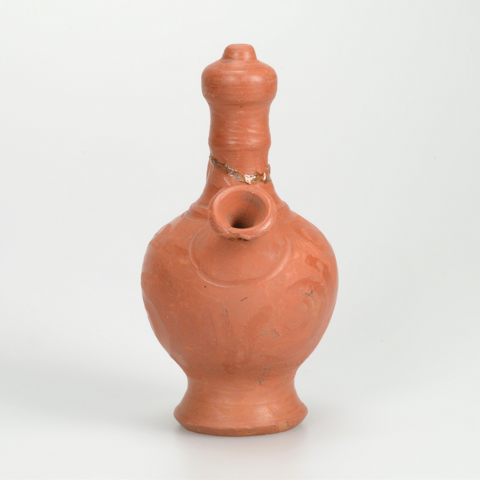 Botijo; terracotta; graffito versiering; twee tuiten; standvoet; herkomst Ibirisch