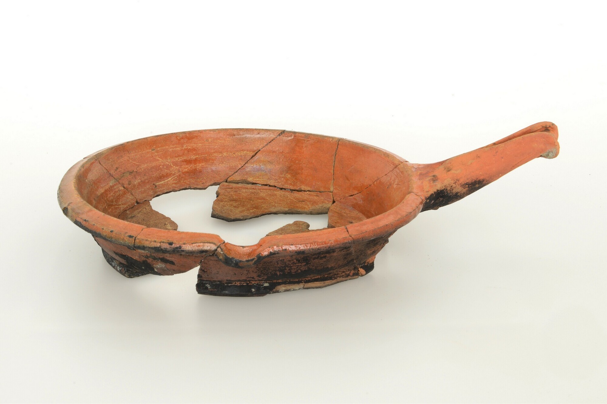 Steelpan; r-bak-23; bakpan met driehoekige rand met groef; roodbakkend aardewerk; inwendig loodglazuur; schenklip; één toegeknepen steel; buitenzijde beroet